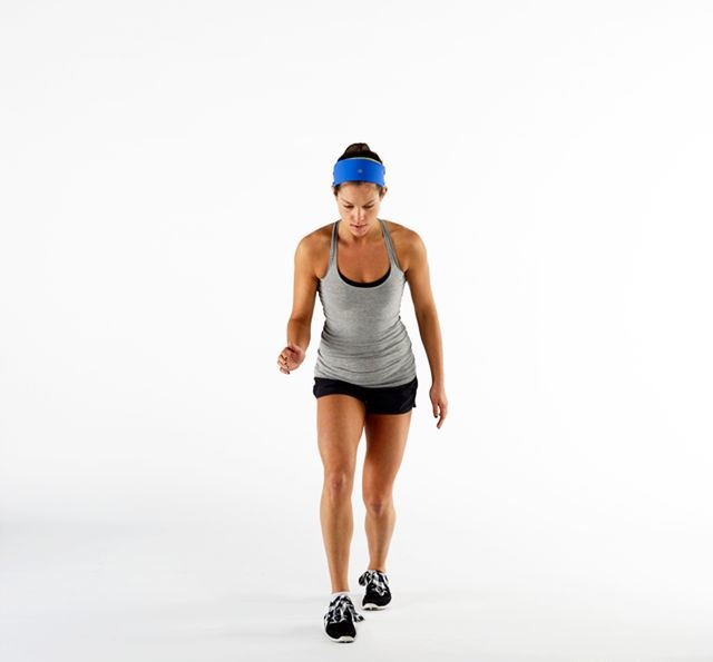 قفي أولاً بشكلٍ مستقيم، ثم قومي بعدة خطوات صغيرة الى الجانب، ثم قفي في نقطة معينة واثني الركبة اليمنى وارفعيها على مستوى معدتك. إنخفضي مجدداً وكرّري الحركة نفسها والخطوات نفسها للجهة المقابلة.