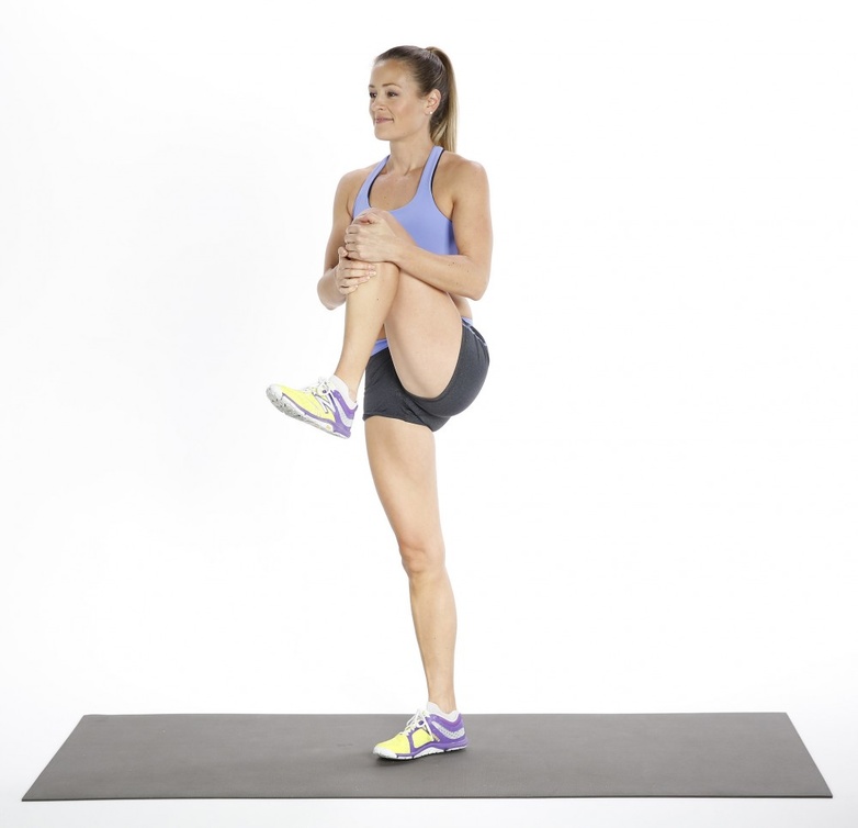 قفي أولاً بشكلٍ مستقيم، واجذبي الركبة اليمنى وارفعيها صوبك وضميهّا بكلتي يديك وقربيهّا صوب صدرك، وكرّري الحركة للركبة الثانية.
