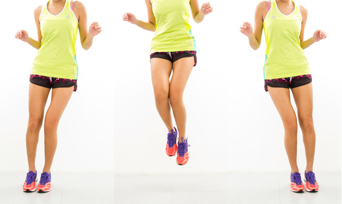 إرتكزي على أصابع قدميك، ثم قومي بحركات مقصية لقدميك بشكلٍ سريع كما تظهر لك الصورة.