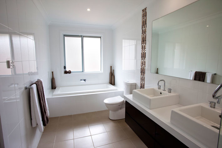 حمام باللون الأبيض من Caroma بإكسسوارات بسيطة وأنيقة باللون البني.