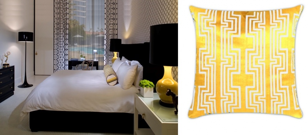 من المهم جداً أن نضيف عناصر مكملة للغرفة بألوان إضافية جاذبة للعين عند استخدام الأبيض والأسود؛ وذلك لكي نكسر الرتابة الناتجة من تكرار اللونين. فمثلاً يتناغم اللون الأصفر المشرق بشكل جميل معهما خاصة في غرف النوم؛ حيث يمكن إضافة بعض الاكسسوارات التي تبرز الأصفر بشكل ناعم دون أن يتضارب مع ما حوله مثل أباجورة جميلة أو وسائد حريرية منقوشة. اخترنا لكم مثلاً وسادة Gyslen Design المصنوعة من الحرير الفاخر بنقشة تعود إلى حقبة الستينيات وبلون أصفر براق أقرب إلى لون الجواهر.