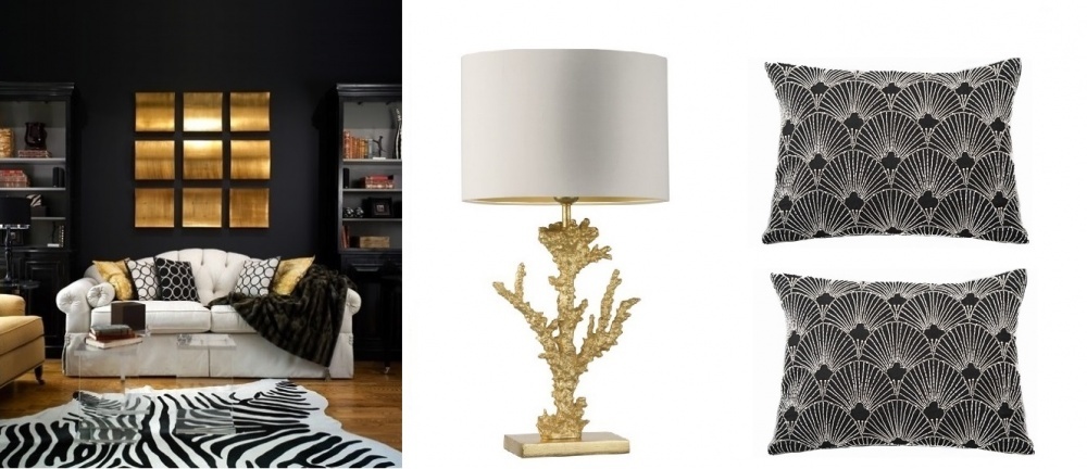 من المهم عند اختيار اللون الأبيض في الديكور ألا يكور صارخاً بحث يتنافر مع الأسود؛ فاللون الأبيض الكريمي أو العاجي قد يكون أكثر درجات الأبيض سلاسة في الديكور؛ وذلك لأنه يمثّل أساساً جميلاً يتناغم بشكل رائع مع الذهبي والفضي. اخترنا لكم مثلاً أباجورة من Heathfield بقاعدة ذهبية ناعمة تضيف رغم بساطتها اللمسة المطلوبة على الديكور الأبيض والأسود وقد اخترنا معها وسائد حريرة مطرزة من Gingerlily.