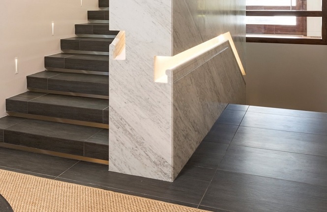 وقد اكتست الجدران الداخلية باللون الأبيض الناصع الذي اختلط بشكل رائع مع اللوحات الفنية الفريدة. أما الخامات فقد تم اختيارها بجودة عالية تنوعت بين الرخام الفاخر في درابزين الدرج والسيراميك الداكن الأنيق وخشب الجوز الأسود والزجاج الفاخر.