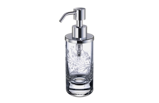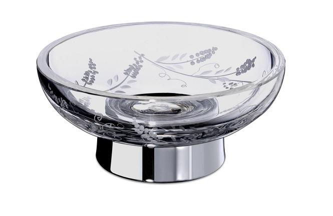 كما اخترنا لكم أيضاً حاوية إسطوانية لكريم اليدين وحاملا للصابون مصنوعين من الكريستال الفاخر المحفور يدوياً على شكل أغصان ملتفة بأناقة من تصميم Zodiac.