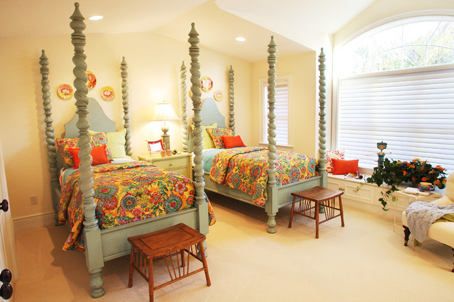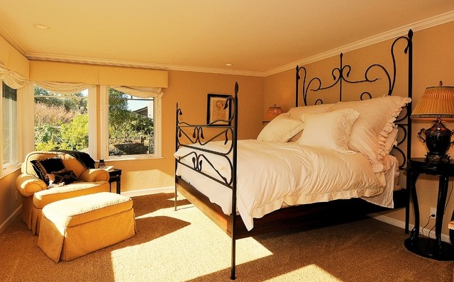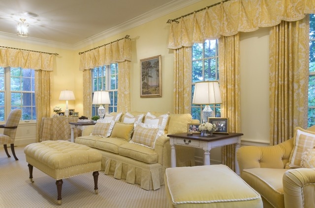 غرفة نوم رومنسية ورائعة بالأصفر الخفيف مع الكريمي منKate Byer Interior Design.