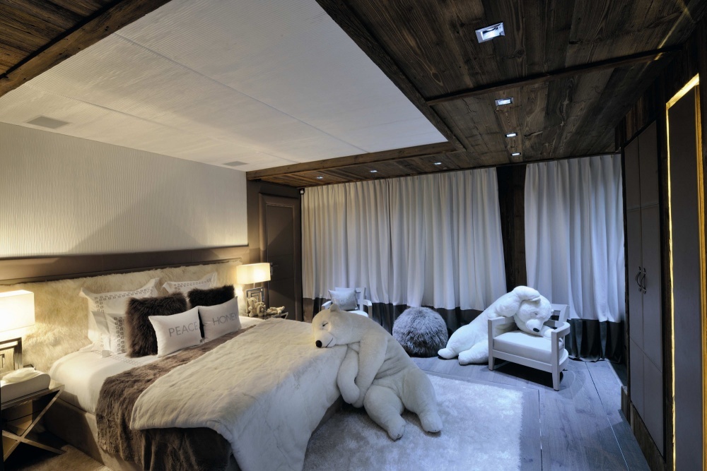 هذا الكوخ يتمتع بديكور مميز لغرف النوم، درج مائل أنيق التصميم يصل بين الأدوار العليا، أرضية الحمام فيه مصنوعة من الرخام الرمادي، يوجد جاكوزي خاص، ومكان مخصص لغسل وتجفيف الملابس. الديكور بشكل عام أنيق وعصري والقماش المستخدم فيه ناعم وجميل المظهر، وجميع الغرف تطل على جبل "مونت بلان".