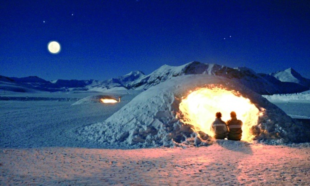 هل قمت بالنوم من قبل في كوخ جليدي؟، إن لم تفعل فعليك تجربة ذلك، هذه الأكواخ الجليدية آمنة للغاية فهي مبنية على أرض مسطحة تماماوقام ببنائها نحاتين خبرتهم تتجاوز العشر سنوات، في داخل الكوخ الجليدي ستجد جلد حيوان الرنة مفروش على الأرض، حقائب حرارية للنوم مبطنة من الداخل بطبقة من الصوف لذلك ستشعر بالدفء على الرغم من أن درجات الحرارة هناك تصل إلى 5 درجات مئوية تحت الصفر. يمكنك هناك تناول الجبن والعسل محلي الصنع ولحم حيوان الرنة.