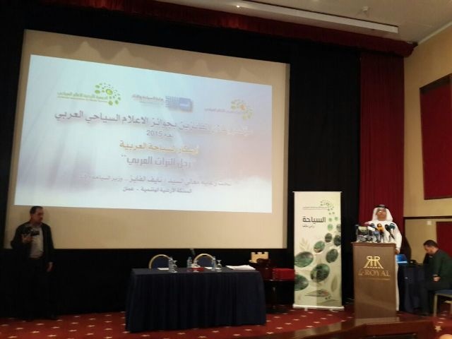 جاء ذلك خلال إعلان المركز العربي للإعلام السياحي، جوائزه للعام 2015، برعاية وحضور وزير السياحة الأردني نايف الفايز، والدكتور عبدالرزاق عربيات رئيس هيئة تنشيط السياحة الأردنية، في فندق الرويال بالعاصمة الأردنية.