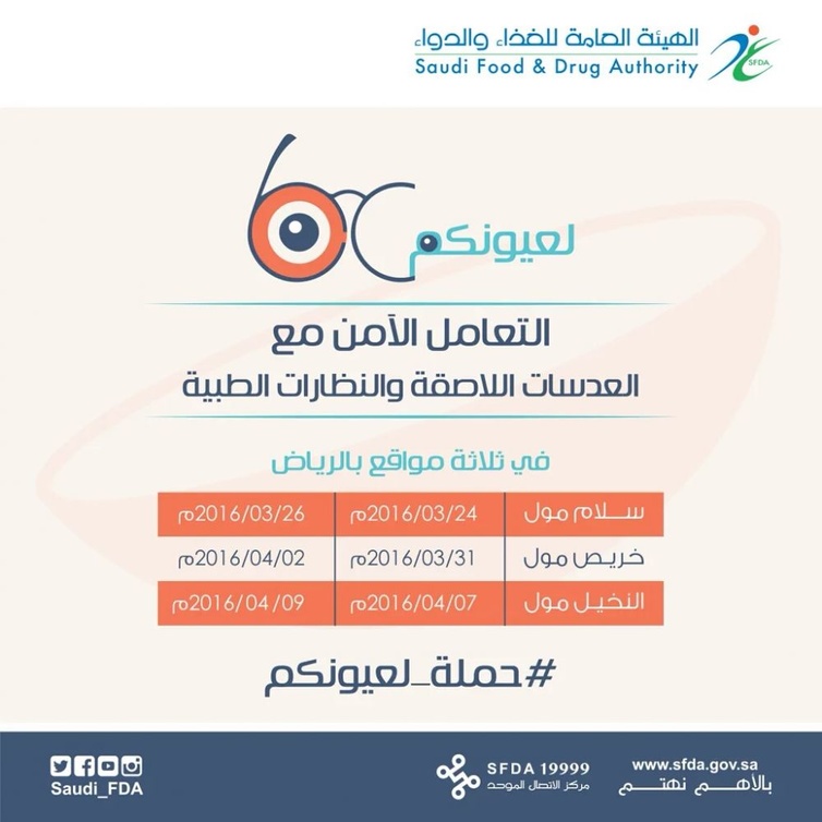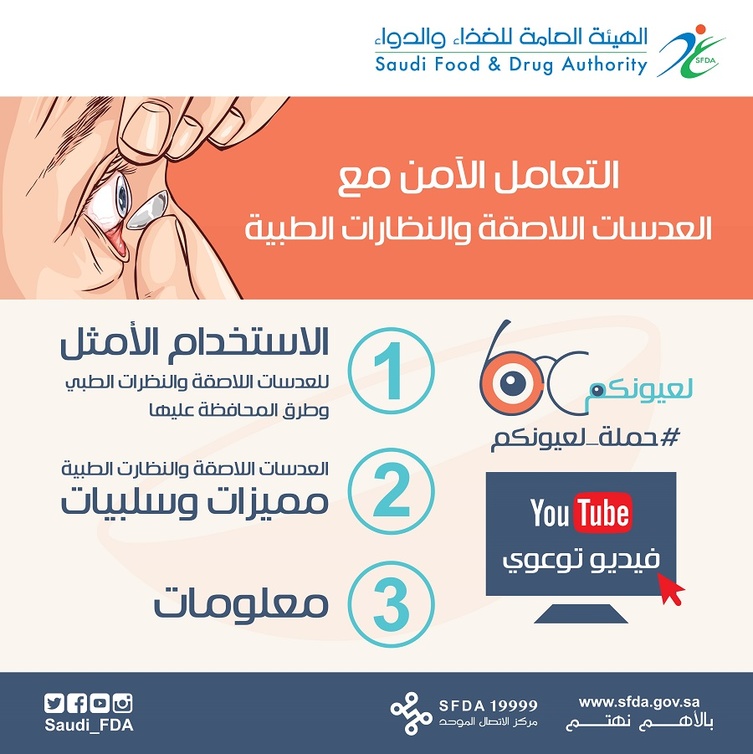 نظراً لانتشار وكثرة استخدام العدسات اللاصقة والنظارات الطبية، اطلقت الهيئة العامة للغذاء والدواء الحملة التوعوية "لعيونكم"، التي دشنها الرئيس التنفيذي للهيئة الدكتور محمد بن عبدالرحمن المشعل، والتي تهدف إلى توضيح الطريقة الصحيحة للتعامل الآمن مع العدسات اللاصقة والنظارات الطبية، والإجراءات الوقائية التي تضمن استخدامها بالشكل الأمثل.