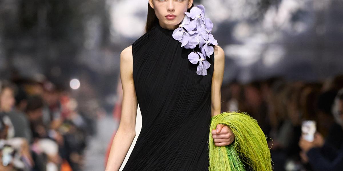 الشرارة المفاهيمية انطلقت من لحظة شخصية. زهور السيكلامين التي قدّمها "غاليانو" لـ"أندرسون" عند اطلاعه على أول مجموعة نسائية له العام الماضي، تحولت إلى النواة العاطفية والبصرية للمجموعة. الزهور والحدائق والجمال المُهذّب تشكّل جوهر لغة ديور، امتداداً لرؤية "كريستيان ديور" للمرأة ككائن زهري نابض بالحياة. انعكس ذلك على فضاء العرض كاملاً. سيكلامين يتدلّى من السقف، يلامس الأذن، ينساب عند فتحات الياقات، ويغمر المكان بحضور احتفالي مكثف. المشهد استدعى جدران الزهور التي أحاطت بعرض "راف سيمونز" الأول عام 2012، مع صدى واضح في اختيارات الألوان وخفة الإيقاع الهوائي في الإطلالة الثامنة عشرة.