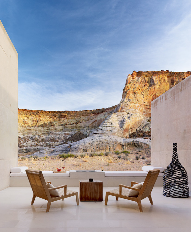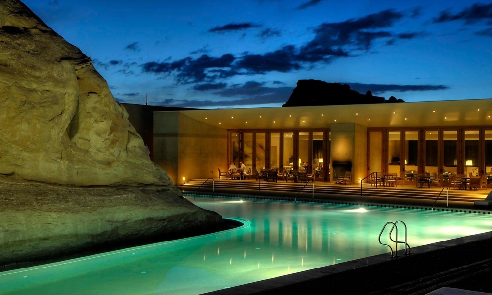 فندق Amangiri أمانجيري بالولايات المتحدة والذي يقع في صحراء جنوب ولاية يوتا ويضم هذا المنتجع ما لايقل عن ستة أجنحة بسقف مفتوح وكلا منهم محمي بواسطة ثلاثة جدران من الرياح ويوفر نظرة لا مثيل لها في سماء الصحراء الشاسعة وتتميز هذه الأجنحة أيضا بوجود حمام سباحة لمن يريدون السباحة بالليل.