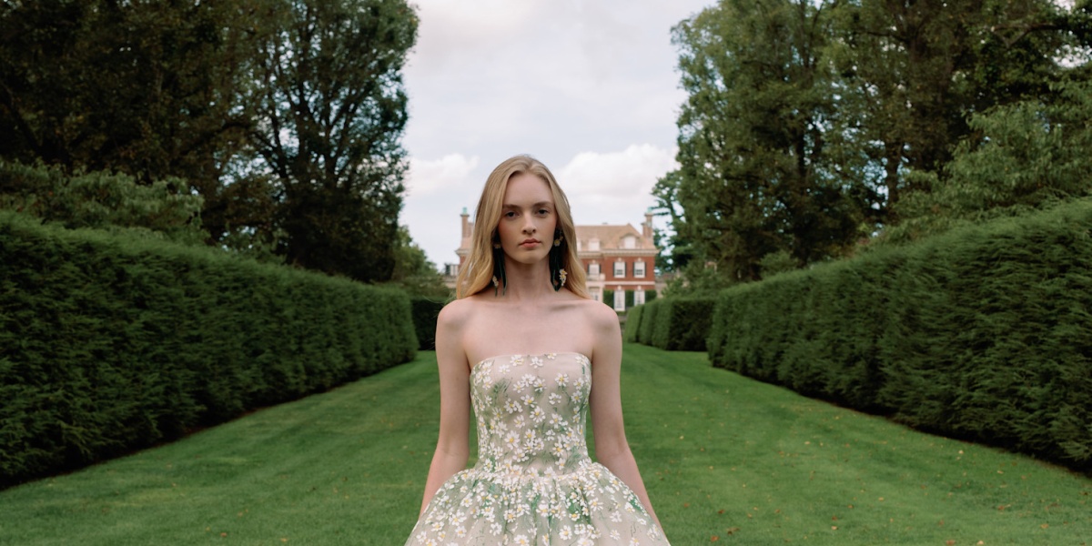 وتزهر الرومانسية في هذه المجموعة عبر تطريزات الأزهار الثلاثية الأبعاد التي تتحوّل إلى لغة من النور والحركة. تتفتح زهور الأورغنزا والتول على فستان بتنورة فخمة ورقبة مربّعة، وكأنها منحوتات حيّة تنبض بأنوثة خالدة، تتراقص مع الضوء في تناغم ساحر بين الملمس والحركة. وفي مشهد آخر من الرقة، تتداخل زهور الساتان والأورغنزا على فستان بلا أكتاف، يتكمّل ببوليرو قابل للإزالة يضفي لمسة عصرية على الرومانسية الكلاسيكية، حيث تمتزج الدقة في الحِرفة بالنعومة في التعبير لتروي قصة أنوثة متجدّدة تتفتح مع كل خيط من الخيال.
