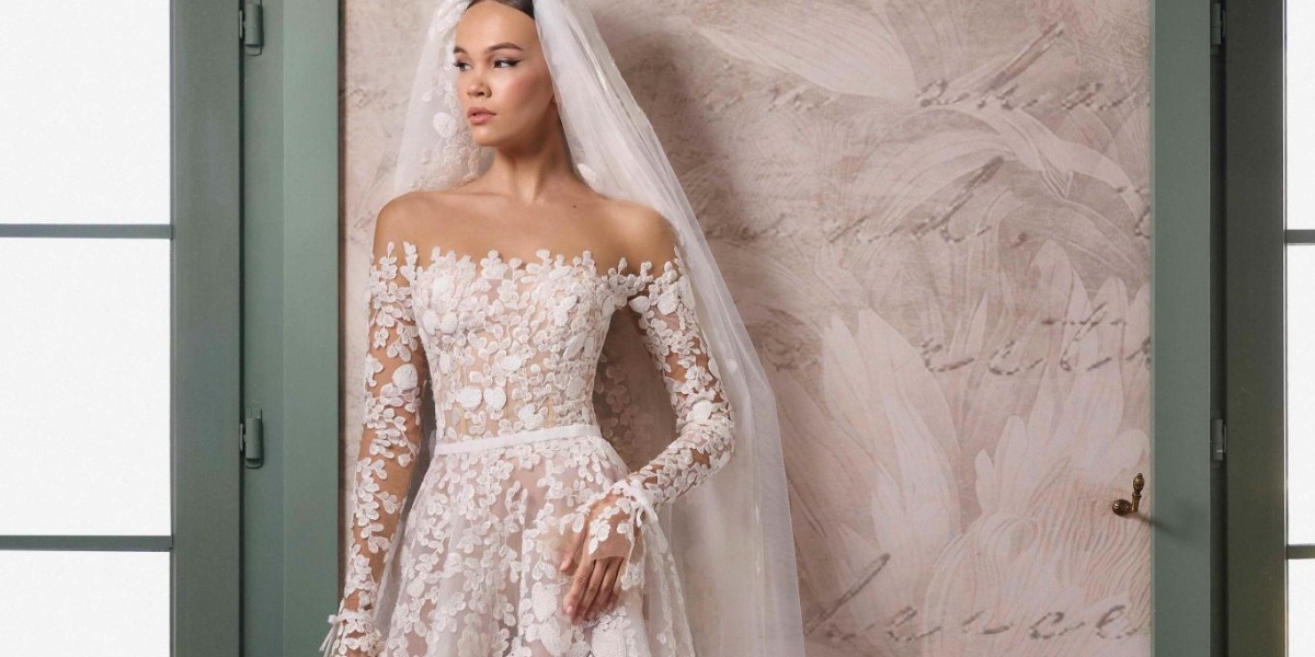 كما لفتنا فستان زفاف آسر بقصّة حورية البحر، مصنوع من دانتيل الشانتيي الفاخر المزيّن بزخارف زهرية تنبض أنوثةً ورقّة. يتميّز بأكمام دانتيل طويلة قابلة للفصل تنسدل بنعومة عن الكتفين، وياقة على شكل قلب تُبرز جمال العنق بخفّةٍ شاعرية. يزدان الكورسيه شبه الشفّاف بتطريزات دانتيل أنيقة وبطانة بلون النيود تُبرز تفاصيل القماش بانسجام راقٍ، فيما يكمّله ذيل قصير يزيد الإطلالة توازناً وأناقة. ويمكن إضفاء لمسة درامية مترفة عبر وشاح العروس المصنوع من الساتان الفاخر، ليكتمل المشهد بأنوثة حالمة وأناقة لا تُنسى.