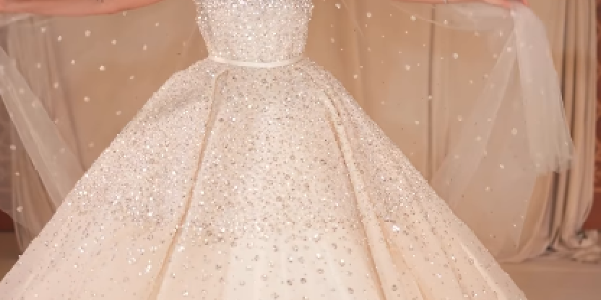 جاء التصميم باللون العاجي، وبقصّة ball gown الفخمة مع صدر مكشوف على شكل قلب وكورسيه مشدود يُبرز الخصر تزينه تطريزات دقيقة من الخرز والترتر اللامع والكريستالات الدقيقة التي غطت القماش وتناثرت بكثافة من الصدر حتى أطراف التنورة لتمنحه وهجاً وبريقًا فريداً.