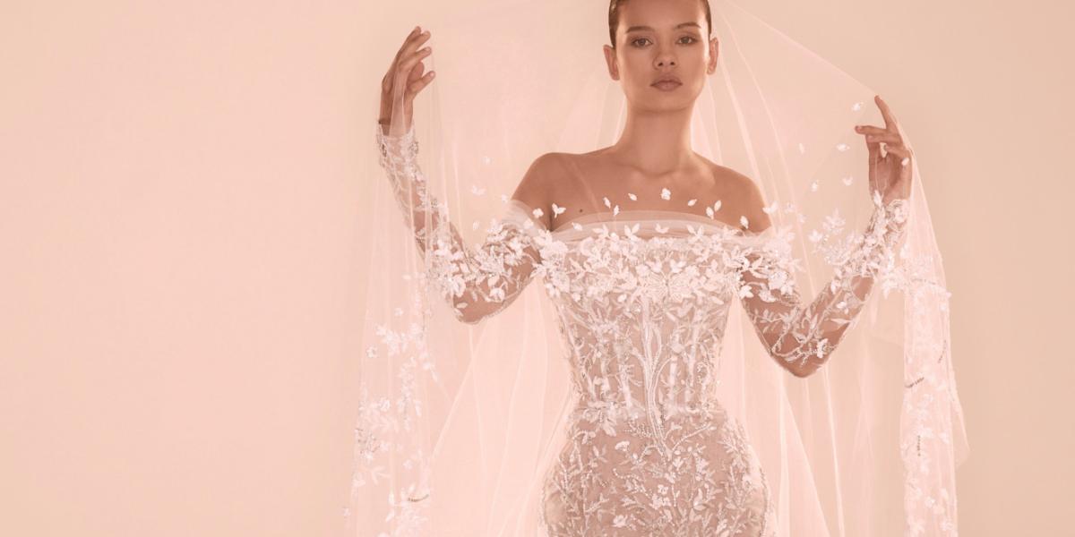 تتألّق الفساتين بالدانتيل الزهري ثلاثي الأبعاد الذي يتحرّك بانسيابية مع قوام العروس، ليخلق حوارًا حيًّا بين النسيج والضوء. يتخلّل اللؤلؤ الناعم التطريزات ليمنح الفساتين وهجًا أنثويًا رقيقًا، فيما تبرز خصور الباسك المنحوتة بدقة جمال القوام بانسيابية تجمع بين القوة والنعومة.
