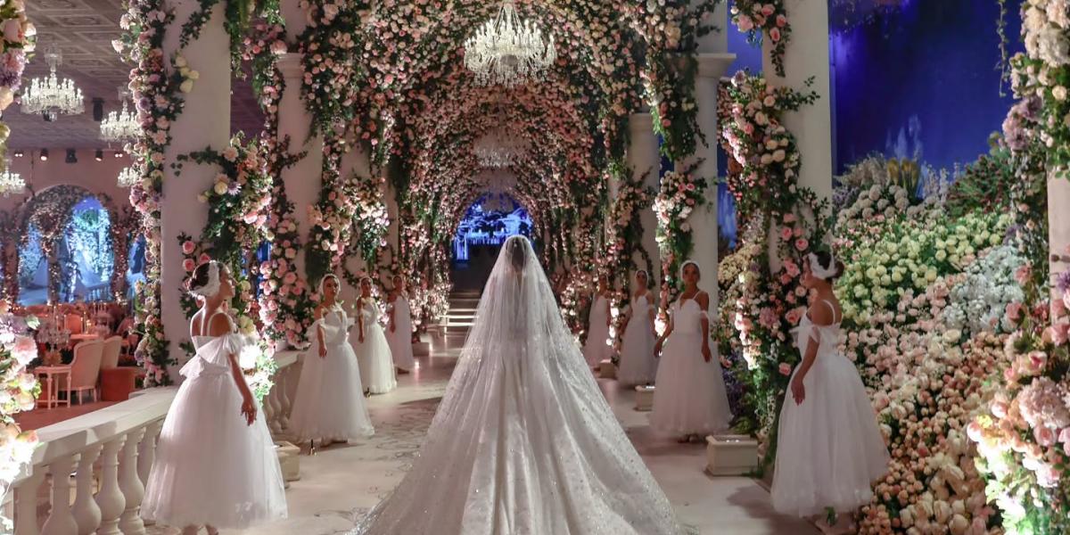 ضخامة قاعة هذا الزفاف تناسبت مع تصميم الفستان الذي أتى بذيل طويل وطرحة لامست الأرض، والتطريزات البراقة جعلت العروس تبدو كنجمة بين ضيوفها. التصميم منفذّ خصيصاً للعروس من دار Maison valentino تطريزاته الكثيفة والتفاصيل التي أدخلت إليه من شك الورود الصغيرة باللون الأبيض وصولاً إلى أكسسوارات الشعر ميزّت العروس فكانت مختلفة عن باقي العرائس.