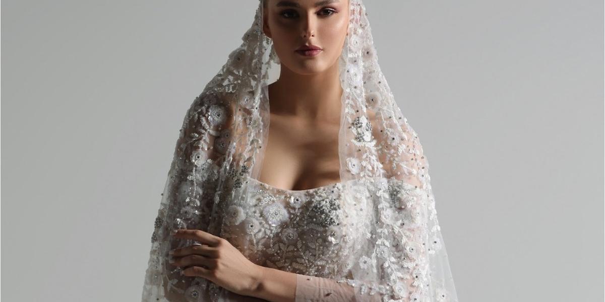 في تصاميم المصممة السعودية Fatima AbdulQadir يظهر الاهتمام الكبير بالحرفية اليدوية. التطريزات الدقيقة تمتد فوق القماش بانسيابية، فيما تضفي الطرحة المطرزة التي تحيط بالفستان هالة حالمة حول الإطلالة. تصميم يبدو وكأنه صُنع ليبقى في الذاكرة، ويجسد العلاقة الحميمة بين الكوتور ولحظة الزفاف.