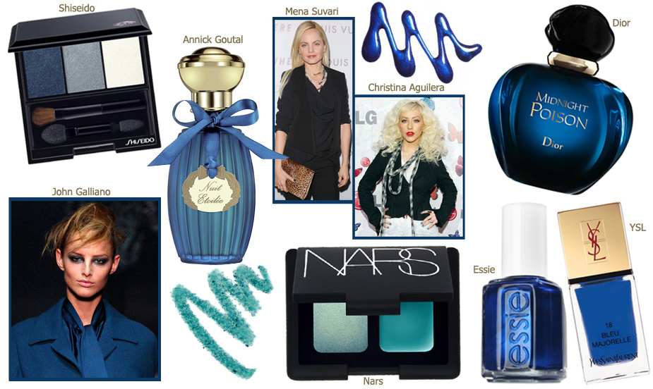تعتبر كل من الممثلة مينا سوفاري Mena Suvari والمغنية الأميركية كريستينا أغيليراChristina Aguilera من عشاق طلاء الأظافر الأزرق، وقد شهدنا هذا العام الكثير من الماكياج الأزرق على منصات العروض بما في ذلك دار هولند House of Holland ، وفيرسوس Versus، و أنطونيو بيراردي Antonio Berardi، وتمبرلي Temperley وإميليو بوتشي Emilio Pucci. يعد طلاء الأظافر الأزرق رائعا جدا بالنسبة لليل أو النهار وظلال هذا الموسم تتنوع وتتدرج مابين الأزرق السماوي والأزرق الحالك. ظلال العيون الزرقاء هي أيضا موضة شائعة لخريف هذا العام، ويمكن استخدام ظلال متنوعة من الأزرق ودمجها معا عند الاشتغال على مظهرك، وتذكري بأن موضة هذا الموسم لا تعتمد على لون واحد لظلال العيون وإنما على التنوع في درجات الألوان. المتاجر: إيسيأروبابلو Essie Aruba Blue من www.essie.com أنيكغوتالنويإيتوالي AnnickGoutalNuitEtoilee من www.harrods.com كريم ظلال العيون نارزديو NARS Duo Cream Eye shadow من www.narscosmetics.co.uk طلاء أظافر الأزرق Yves Saint Laurent La Laque Couture Rouge Nail Polish N17 blue من www.saksfithavenue.com ألوان العيون الثلاثية in snow shadowShiseido Luminizing Satin Eye Color Trio من www.shiseido.co.uk عطر ديور ميدنايت بوازون Dior Midnight Poison من www.johnlewis.com