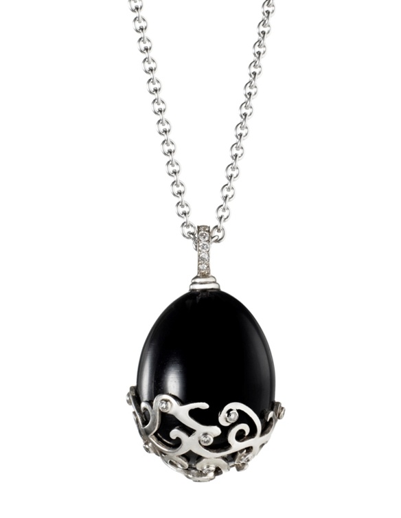 بيضة لامعة من العقيق الأسود ، مصممة في إطار روكوكو فضي ، مرصع بالألماس الأبيض ، وينتهي عند قاعدته بماسة بيضاوية .