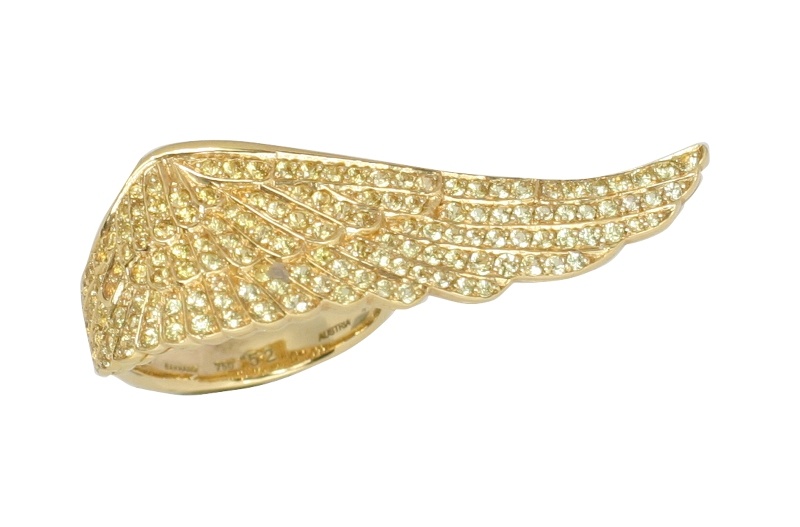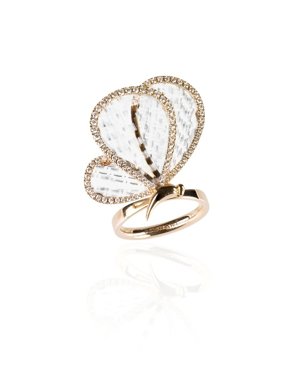 خاتم بديع على هيئة فراشة من الذهب الوردي ، تتلألأ فيه الحيوية والماسات الصقولة بدقة .