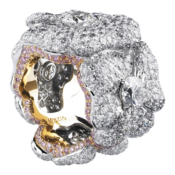 نموذج من الذهب الأبيض والوردي ، وكل مشبك أذن مرصع في المنتصف بماسة تزيد قليلاً عن قيراط واحد ، أما الأوراق المنحنية فمرصعة بماس أبيض ، ومحاطة بخط رقيق من الألماس الوردي .