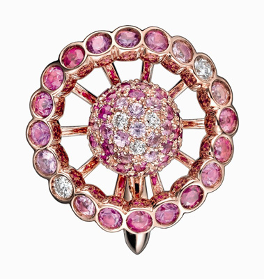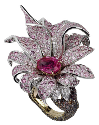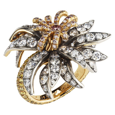 لقد تم تصميم خاتم مانجوليا المفعم بالحركة ، باستخدام ثلاثة ألوان من الألماس ، الأبيض للبتلات ، الوردي لقلب الزهرة ، والألماس الأصفر المصقول يلتف حول شريط الخاتم .