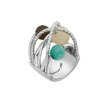 خاتم به نجمة خضراء كبيرة من حجر الأميثست و الكريستال الزغبى المدخن اللون و كريستال أبيض براق لإنشاء شكل تركيبة مميزه شفافة غير متوقعة من تأثيرات الألوان . تعطى هذه الجوهرة النفيسة سحر يمكن أن تقف لحظة فجأه .