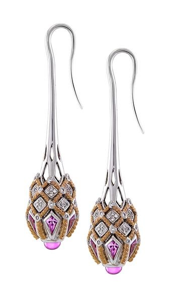 اقراط Venetian Rose Windows من Bizzotto: وهي مزيج من الذهب الابيض والوردي عيار 18 قيراطاً مرصعة بالماس والياقوت الازرق ابدع مصمموا شركة Bizzotto الإيطالية بتصميمه. وتبلغ قيمتها حوالي 9000 دولاراً. للحصول عليها، الاتصال بالوكلاء مجوهرات Medawar بكافة فروعها.