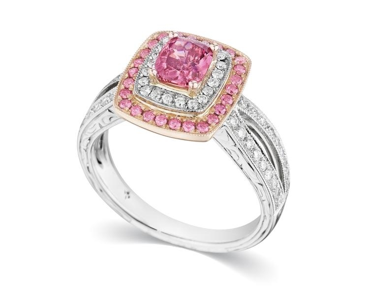 خاتم Beverly من مجوهرات Fiamma: طوّرت مجوهرات Fiamma تقنية خاصة لتغيير لون الماسات الوردية، وطبّقتها في صناعة هذا الخاتم من الذهب الابيض والوردي عيار 14 قيراطاً الذي تتوسطه حبّة من الماس الوردي على شكل وسادة عيار 1.3 قيراطاً تحيط بها 82 حبة ماس مستديرة باللونين الابيض والوردي. قيمة الخاتم حوالي 6,800 دولاراً ولمعلومات عن كيفية شرائه عبر الموقع الإلكتروني:www. fiammajewelry.com