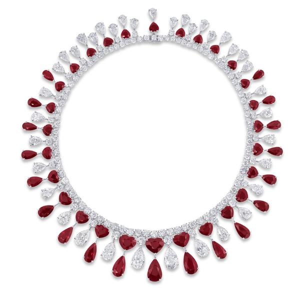 عقد من الياقوت والماس من Graff: يحتوي على 69.40 قيراطاً من الماس و108.10- قيراطاً من الياقوت إجاصية وقلبيّة الشكل. تفاصيل السعر متوفرة في متاجر Graff Diamonds.