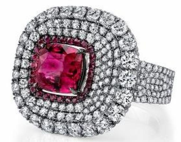 خاتم Divine من مجوهرات Martin Katz: يحمل هذا الخاتم المصنوع من الذهب الابيض 18 قيراطاً حبة ياقوت على شكل وسادة زنتها 2.56- مع 336 حبة ماس دائرية الشكل و 26 حبة ياقوت دائرية. السعر والتفاصيل متوفرة بمتاجر Martin Katz في بفرلي هيلز.