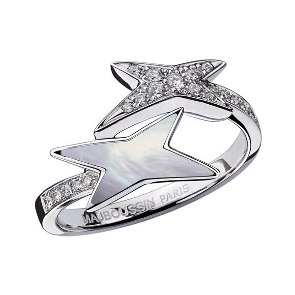 خاتم Etoile de Vie من Mauboussin: وهو مصمم على شكل نجمتين من الذهب الابيض تعتليها حبة لؤلؤ mother of pearl بيضاء إلى جانب حبة اخرى مرصعة بالماس. تبلغ قيمة الخاتم 2100$ وهو متوفر في بوتيك Mauboussin في Madison Avenue، نيويورك.