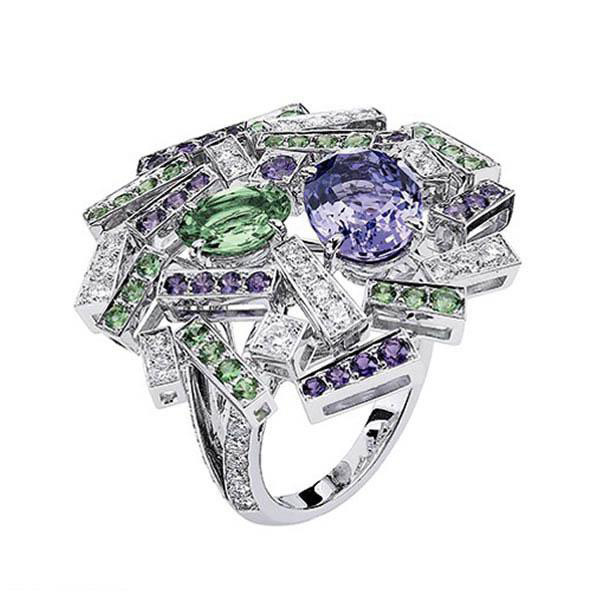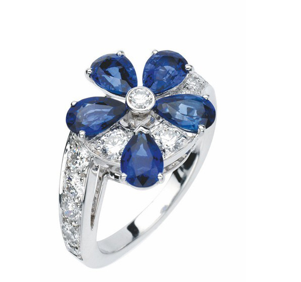 ضمن تشكيلتنا هناك أيضا خاتم من "فان كليف & آربلز Van Cleef and Arpels"، مصمم على شكل زهرة رقيقة ناعمة مرصع بالماس مع قطع كمثرية الشكل من السفير الأزرق تجسد بتلات الزهرة. وقد أضفت الدقة والاتقان في تصميم البتلات الى الزهرة مشهدا طبيعيا زاد من جمال التصميم وجاذبيته.