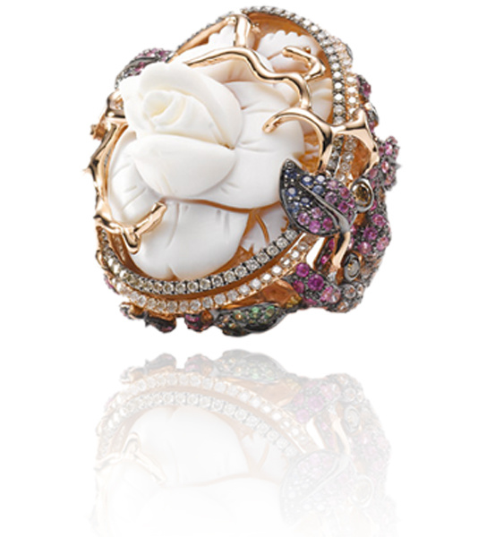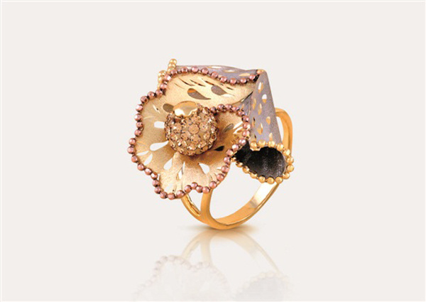 لدينا كذلك خاتم من "ويندي يو" Wendy Yue بحلة الأزهار؛ يتميز تصميمه الجميل بدقة رائعة وتألق إبداعي يمزج بين الذهب الوردي والماس وأحجار ثمينة من الياقوت بألوان مختلفة مازاد من رونقه وجاذبيته.