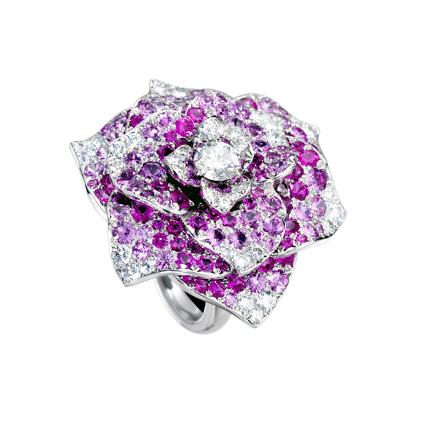 لدينا خاتم من "بياجه Piaget"، من الذهب الأبيض مرصع بأحجار السفير الوردي والماس ما أعطاها مزيدا من البريق والفخامة والأناقة ليكون بحق تحفة جميلة؛ الأحجار مرصوصة بأسلوب جميل جدا جاء متناسقا مع التصميم ومتماشيا مع جماله الطبيعي.