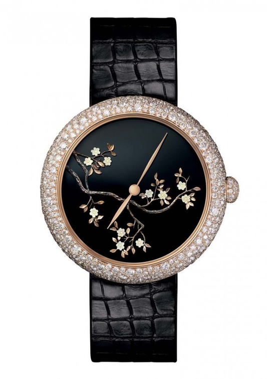 لدينا أيضا ساعة "شوميه Chaumet" انتقيناها من مجموعة "هورتنسيا كرياتيف كمبليكايشن Hortensia Creative Complication" وهي تشكيلة تعتمد في تصاميمها الجذابة على أشكال الأزهار. تم ابتكار هذه القطعة باستخدام الماس والياقوت الوردي وزهرة صغيرة وردية اللون منحوتة بأسلوب جميل من صدف اللؤلؤ مع إطار من الذهب الأبيض ما أعطى للساعة حلة مبهرة تفيض بالتألق.