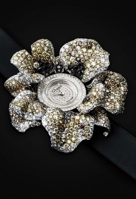 نبدأ مختاراتنا بتصميم فخم على شكل زهرة أثمر عن ساعة فاخرة من تشكيلة "لايف Life" لماركة "شارا ون Chara Wen". تتميز هذه الساعة بدقة مثالية في تفاصيلها الجميلة فضلا عن شكلها الذي يجسد جمال الزهرة بإتقان بالغ وذلك من الذهب الأبيض والأصفر والأسود.