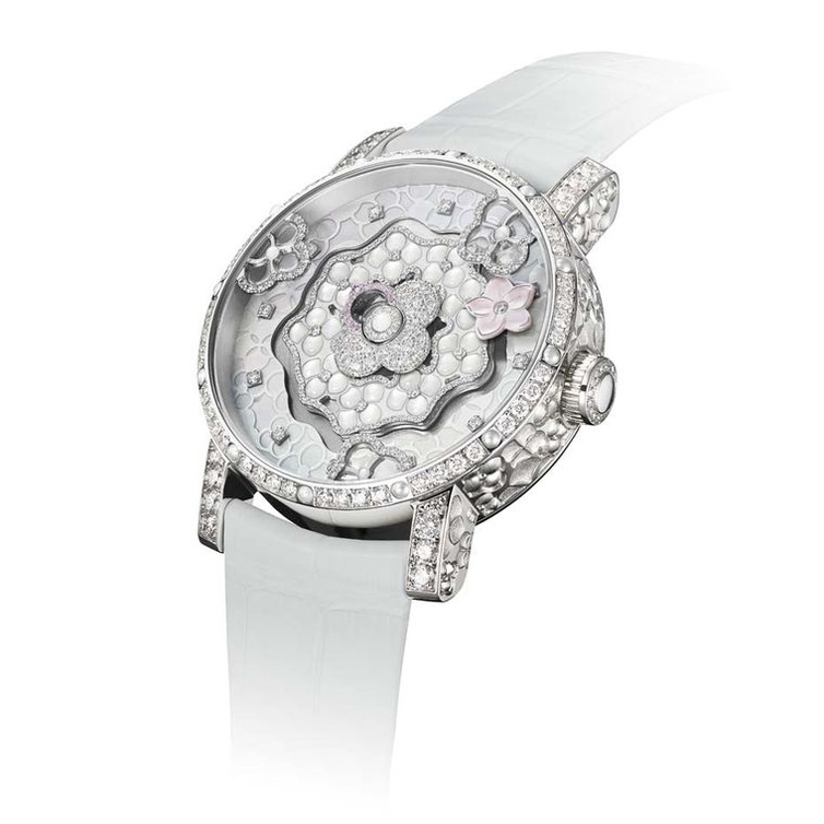 ساعة أخرى مميزة من "لويس فيتون" اخترناها من تشكيلة "تامبور مونوغرام سان توربيون Tambour Monogram Sun Tourbillon" النسائية. تشع هذه الساعة بجاذبية ساحرة تنبع من اللون الوردي لزهرة منحوتة من صدف اللؤلؤ ولمعان الفصوص الماسية الثلجية الشكل التي يطوقها خط دائري مكون من فصوص الياقوت الوردي؛ فضلا عن حزام الساعة المصنوع من جلد التمساح بلون فوشي مثير.