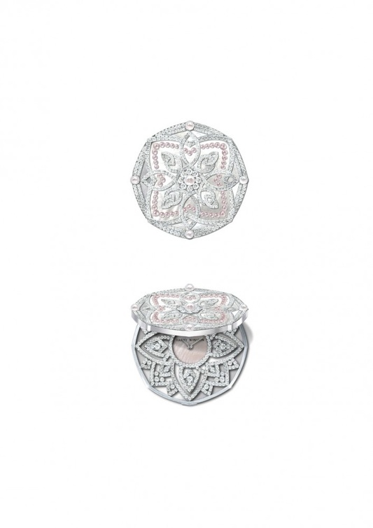 تليها ساعة سرية على شكل علبة البودرة المضغوطة من "هاري وينستون Harry Winston ". تم تصميم هذه الساعة بأسلوب ساحر للغاية استُخدِمت فيه خطوط هندسية مثيرة لتشكيل رسوم الزهرة على غطاء خارجي من صدف اللؤلؤ مطعم بالياقوت الوردي والماس. ويضم هذا الغطاء الخارجي بداخله مرآة وساعة مكنونة تتربع وسط زخرفة أنيقة.