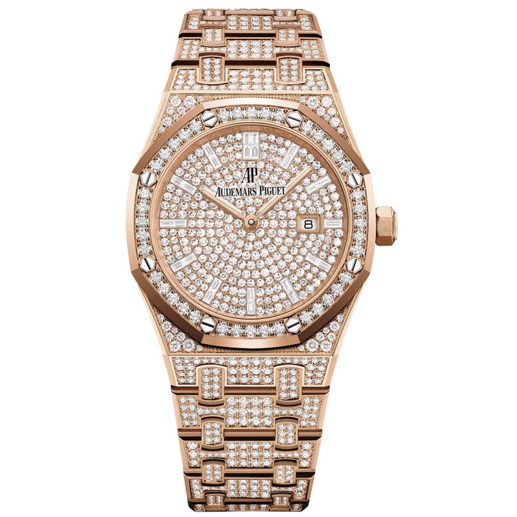 من علامة أوديمار بيغيه نختار ساعة Royal Oak Quartz الفاتنة بتصميم يزين المعصم بالفخامة والبريق في سحر الذهب الوردي وأحجار الماس المرصوفة.