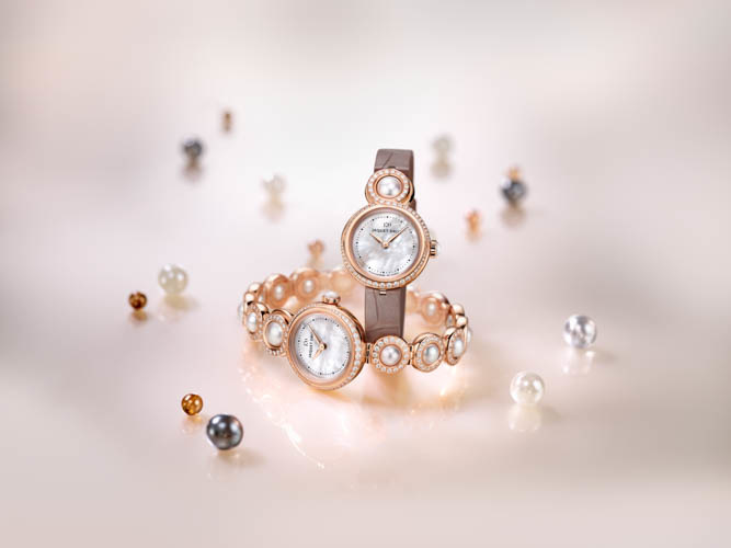 ورُصّعت وصلات سوار التصميم الأول بشكل فردي بأحجار الألماس، وهي تحتضن كقلب ثمين أحجار لآلئ أكويا أصيلة. تشتهر هذه اللآلئ التي لا يمكن العثور عليها إلا في آسيا على الحدود الفاصلة بين الصين واليابان، بليونتها وتوهجها وسطحها اللماع في الوقت نفسه. ومن خلال لونها الأبيض الطبيعي الفريد، تتماشى هذه اللآلئ مع ميناء ساعة Lady 8 Petite الرفيعة والنقية من عرق اللؤلؤ وحجر الكابوشون الذي يزيّن التاج.