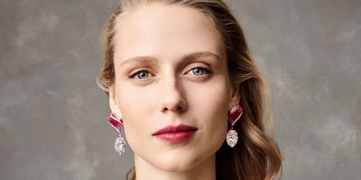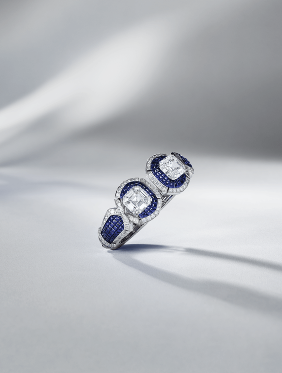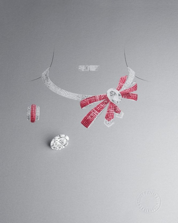 مستوحاة من أقمشة التول في خمسينيات القرن الماضي ، تم تزيين هذه الإبداعات بشرائط السافير الوردي الثمينة المتشابكة مع صفوف من الياقوت ذات السطح المصقول. تمنح درجات اللون الوردي إلى الأحمر الناري مكانًا رائعًا لثلاثي وثنائي من الماس ،بوزن 3.88 و1.17 و1.19 قيراط للسوار و 2.36 و 1.54 قيراط للخاتم. أولى الحرفيون في الدار اهتمامًا خاصًا إلى الحزام الحجري المركزي في ترتيب متعامد فريد يؤكد الخطوط الرسومية لقطع الإميرالد. تكشف هذه العناصر عن نقاء وتألق الأحجار، معززة بهيكل مخرّم بعناية للسماح بمرور الضوء.