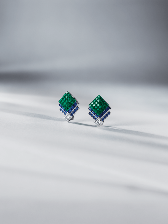 تتميز أقراط أذن وخاتم إيكو ميستيريو بثلاثة ماسات: زوج من 12.65 و 12.61 قيراط وحجر 25.06 قيراط. تجمع الخطوط النقية لقطع كوشن بين التألق الشديد لـ 57 جانبًا مع سطح كبير بما يكفي للكشف عن نقاء المادة. تقدر الدار بشكل خاص العمل بهذا الشكل لسحره وقدرته على إبراز نيران الماس - ذان اللمعان بألوان قوس قزح. هنا، تتناقض الأحجار مع اللون الداكن للسافير والزمرد الأخضر الكثيف. يتم ترصيع هذه الأخيرة باستخدام تقنية ميستري ست التقليدية بينما يتم صقل سطحها مما يبرز المظهر المخملي للقطع. تتطابق الأقراط دون أن تكون متطابقة ، حيث تنعكس الألوان من قطعة إلى أخرى. إنها تؤدي إلى تحولات دقيقة بفضل القلادات القابلة للفصل. تكتمل القطعة بماستين دائريتين مقطوعتين من نفس الحجر الخام.