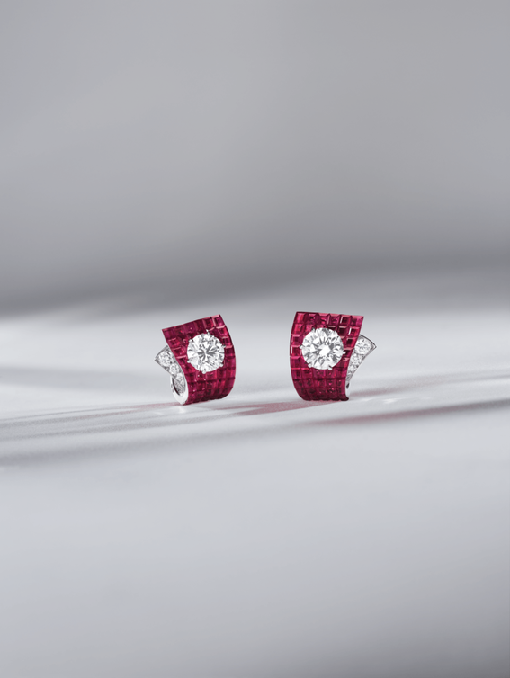 تُثبّت صفوف الياقوت ذات سطح مصقول ومرصع بتقنية ميستري ست تأثيرًا أحمر مخمليًا ومكثفًا ، بينما يثري السافير الوردي لوحة الألوان بظلاله الرقيقة. من خلال خطوطها الديناميكية والترصيع غير المتماثل واختيار الأحجار، تجسد هاتان الجوهرتان أسلوب توقيع دار فان كليف أند آربلز الذي يقع بين الخفة والأناقة.