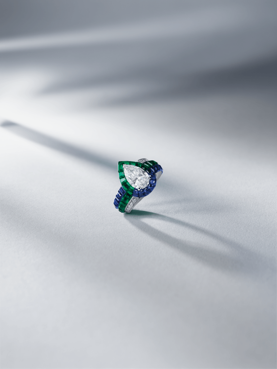 يكشف الخاتم عن النقوش الدقيقة، حيث تم ترصيع الماسة المركزية على هيكل ذي مخالب مرتفعة قليلاً. مع وضعه غير الوسطي بين إصبعين، يصل الحجر إلى ذروة ارتفاعه في الجزء العلوي من شريط مرصع بتقنية ميستري ست الذي تضفي حركته غير المتكافئة لمسة عصرية على اليد.