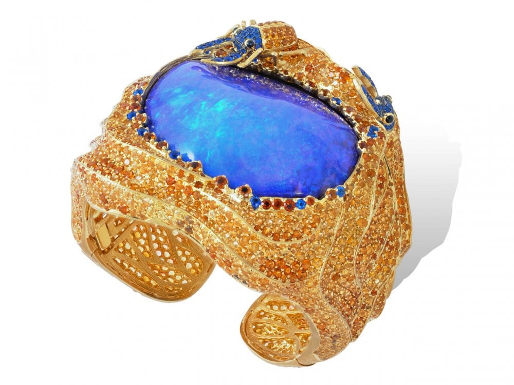 من علامة ليديا كورتيل نختار اسوارة من مجموعة Sahara بتصميم راقي من وحي رمال الصحراء الذهبية ومياه الواحات مع خنفساء الجعران الصحراوية في تألق الذهب الأصفر والأوبال واليهونايت والهيزونايت والياقوت الأزرق والأصفر والبرتقالي.