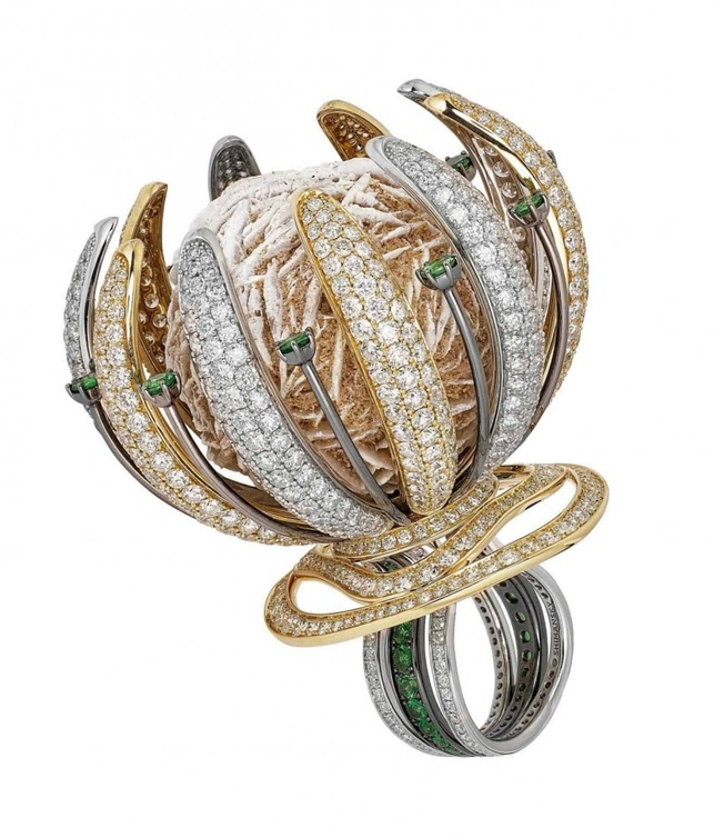من علامة Shimansky نختار خاتم خلاب بتصميم مستلهم من وحي نبات زهرة الصحراء بأناقة الذهب والماس وأحجار الكريستال والتسافوريت.