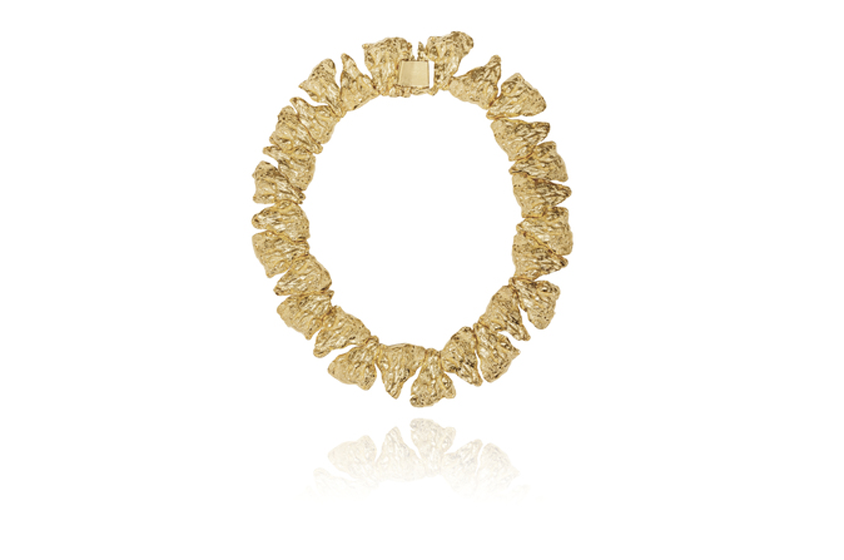 من أعمال المصممة الاماراتية عليا بن عمير نختار قلادة مستلهمة من أشجار اللبان التي تنمو في صحاري وجبال شبه الجزيرة العربية بأناقة الذهب الأصفر المطروق.