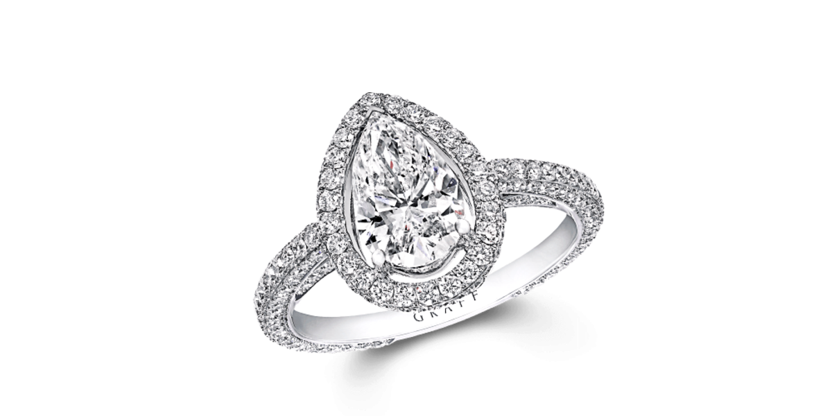 ومن علامة غراف Graff، اخترنا لك خاتم رفيع مرصع بأحجار الألماس الأبيض مع حجر الألماس بقصة الإجاصة في الوسط.