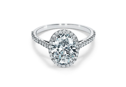 من علامة تيفاني اند كو Tiffany & Co، اخترنا لك خاتم بلاتين رفيع مرصع بأحجار الألماس الصغيرة مع حجر الألماس البيضاوي في الوسط
